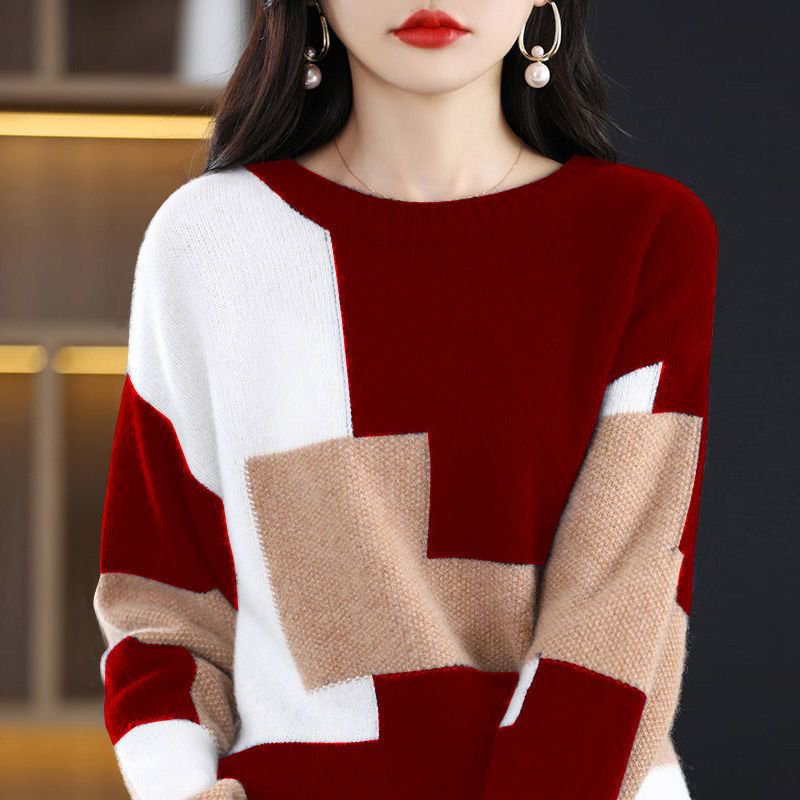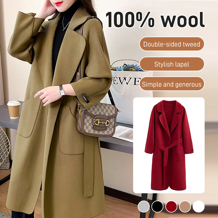 Hepburn-style color-blocked women's medium-length cashmere coat
